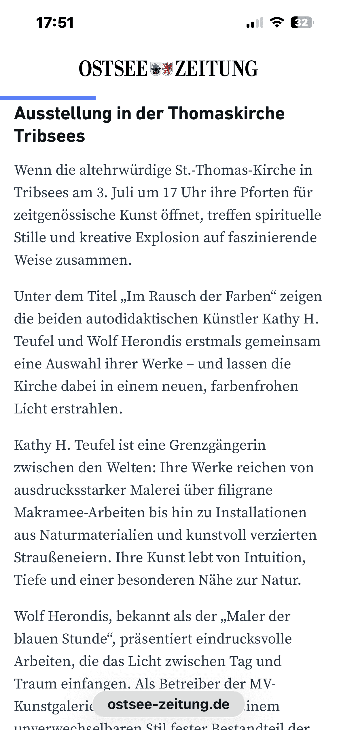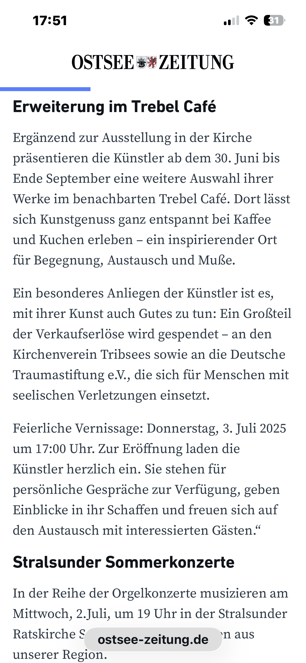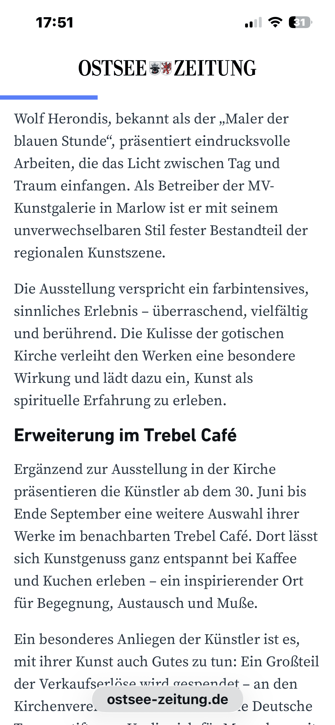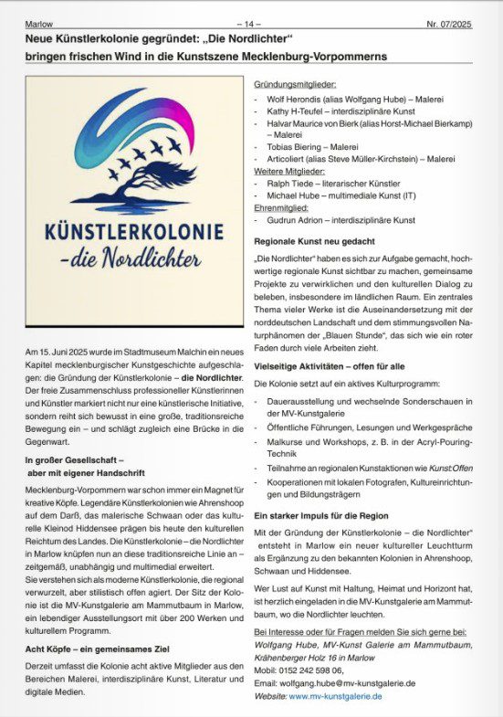 Der Marlower Kurier berichtet in seiner Ausgabe 07/2025 über die Gründung der Künstlerkolonie „Die Nordlichter“. Am 15. Juni 2025 wurde in der Stadtmühle Malchin ein neues Kapitel