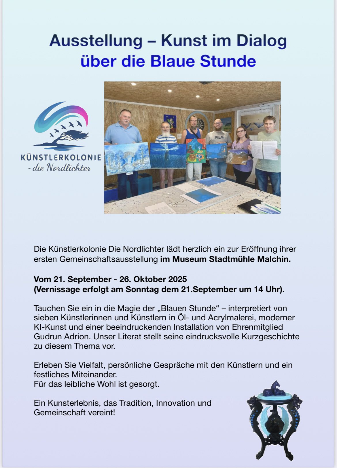 Die Künstlerkolonie „Die Nordlichter“ lädt herzlich ein zur Eröffnung ihrer ersten Gemeinschaftsausstellung im Museum Stadtmühle Malchin. Vom 21. September bis 26. Oktober 2025 präsentieren sieben Künstler ihre Interpretationen der